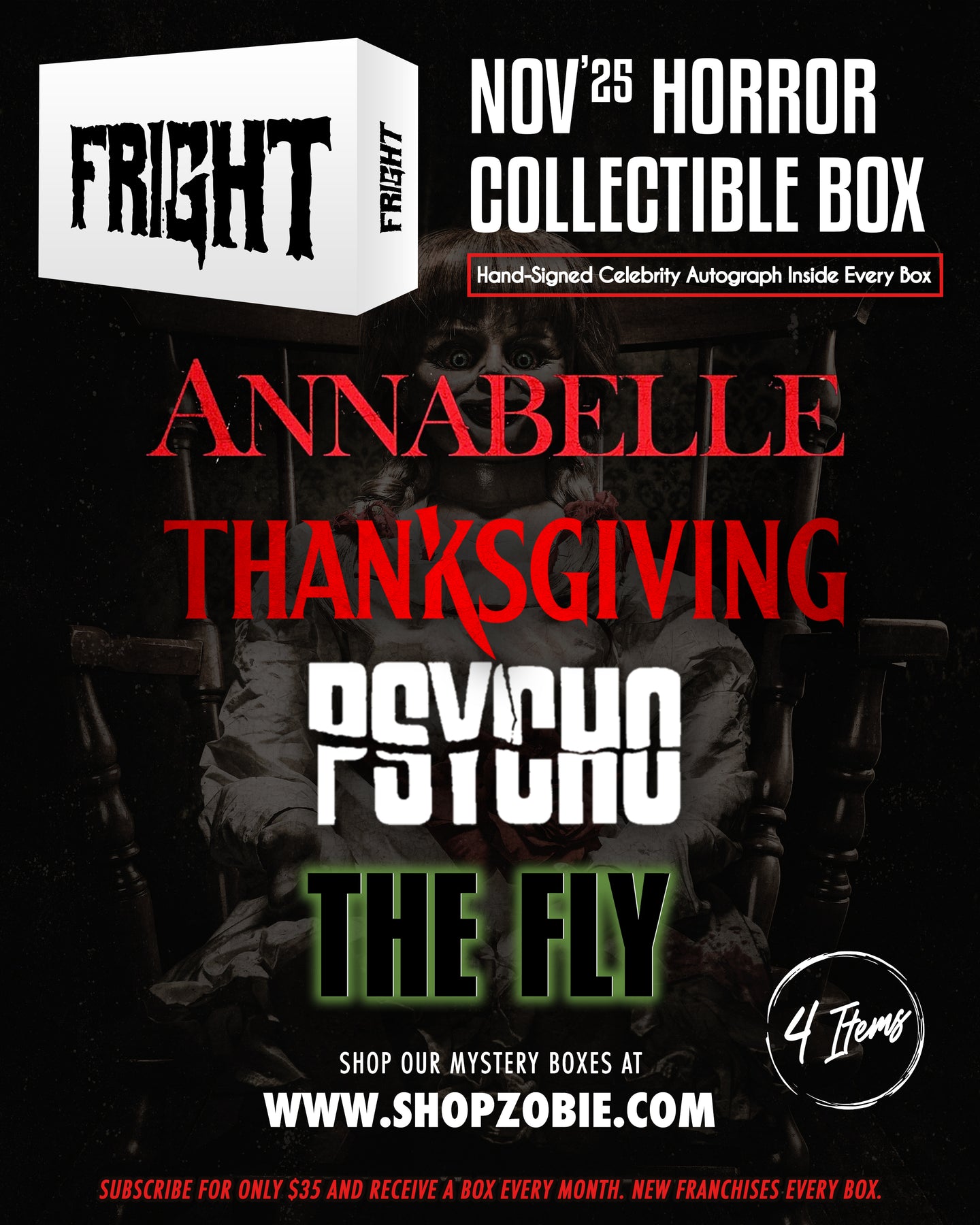 Discover the thrill of our limited edition monthly subscription, Zobie Fright Box, packed with spine-chilling horror collectibles and an authentic celebrity autograph.