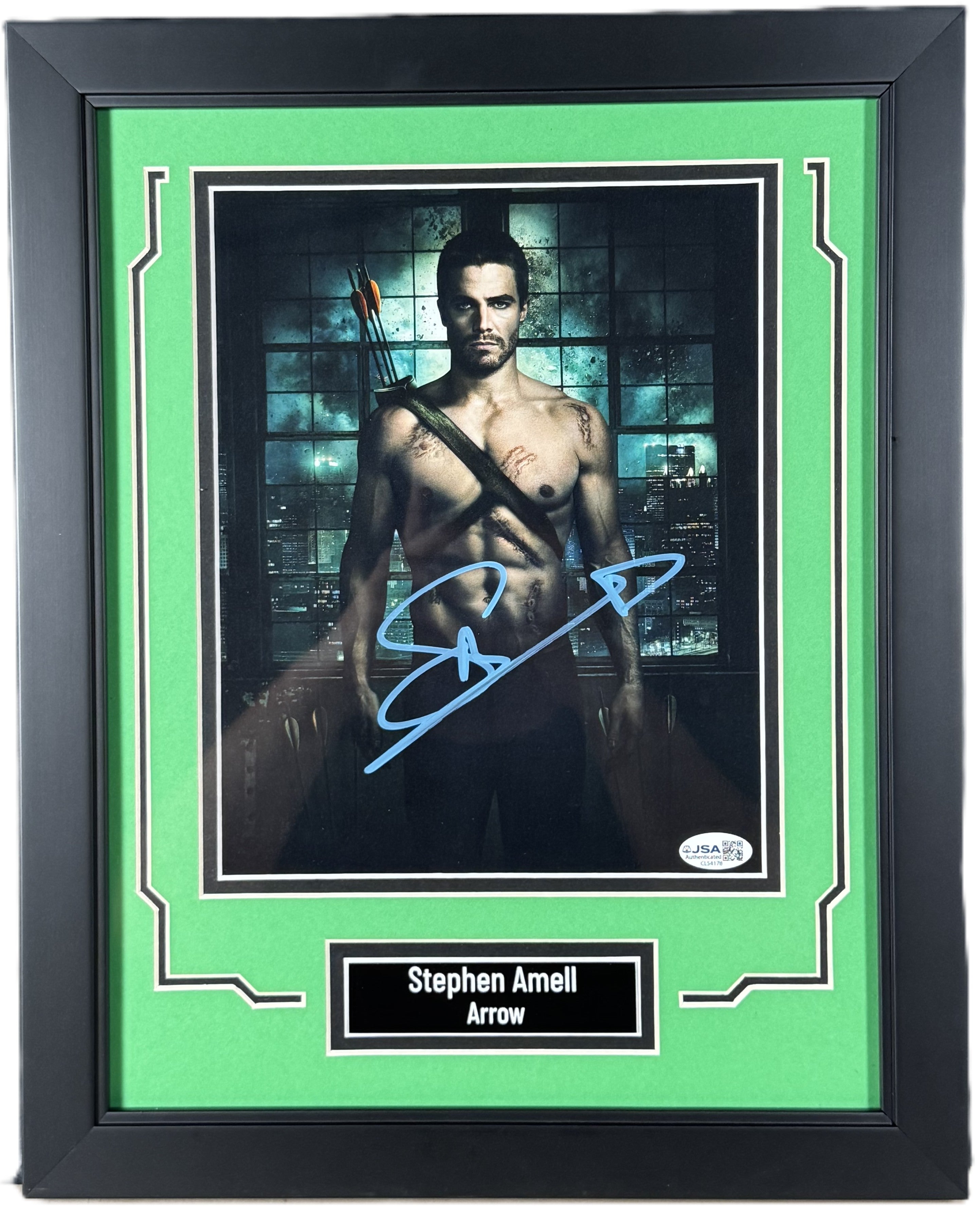 Authentic hand-signed 8x10 photo of Stephen Amell, featuring his iconic portrayal of Oliver Queen / Green Arrow in the CW superhero series Arrow. This autograph is fully authenticated by James Spence Authentication (JSA) and includes a Certificate of Authenticity (COA), making it a highly desirable collectible for superhero, comic book, and television fans.
