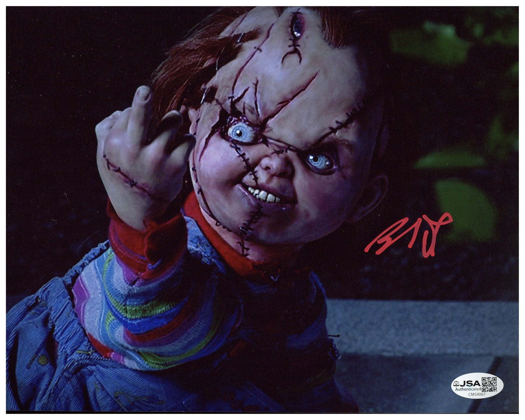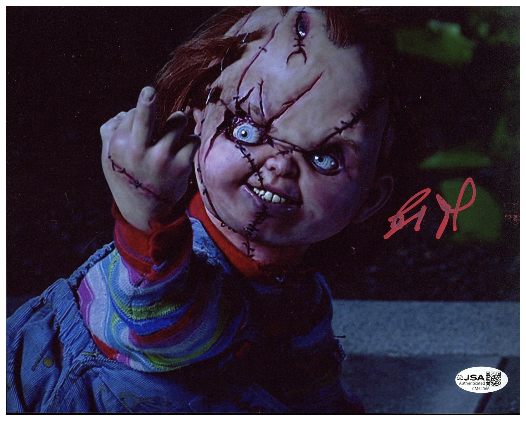 This high-quality 8x10 image captures the sinister presence of Chucky, making it a perfect collectible for fans of classic horror and slasher films. The bold autograph adds authenticity and collector value, turning this piece into a standout addition to any memorabilia collection.
