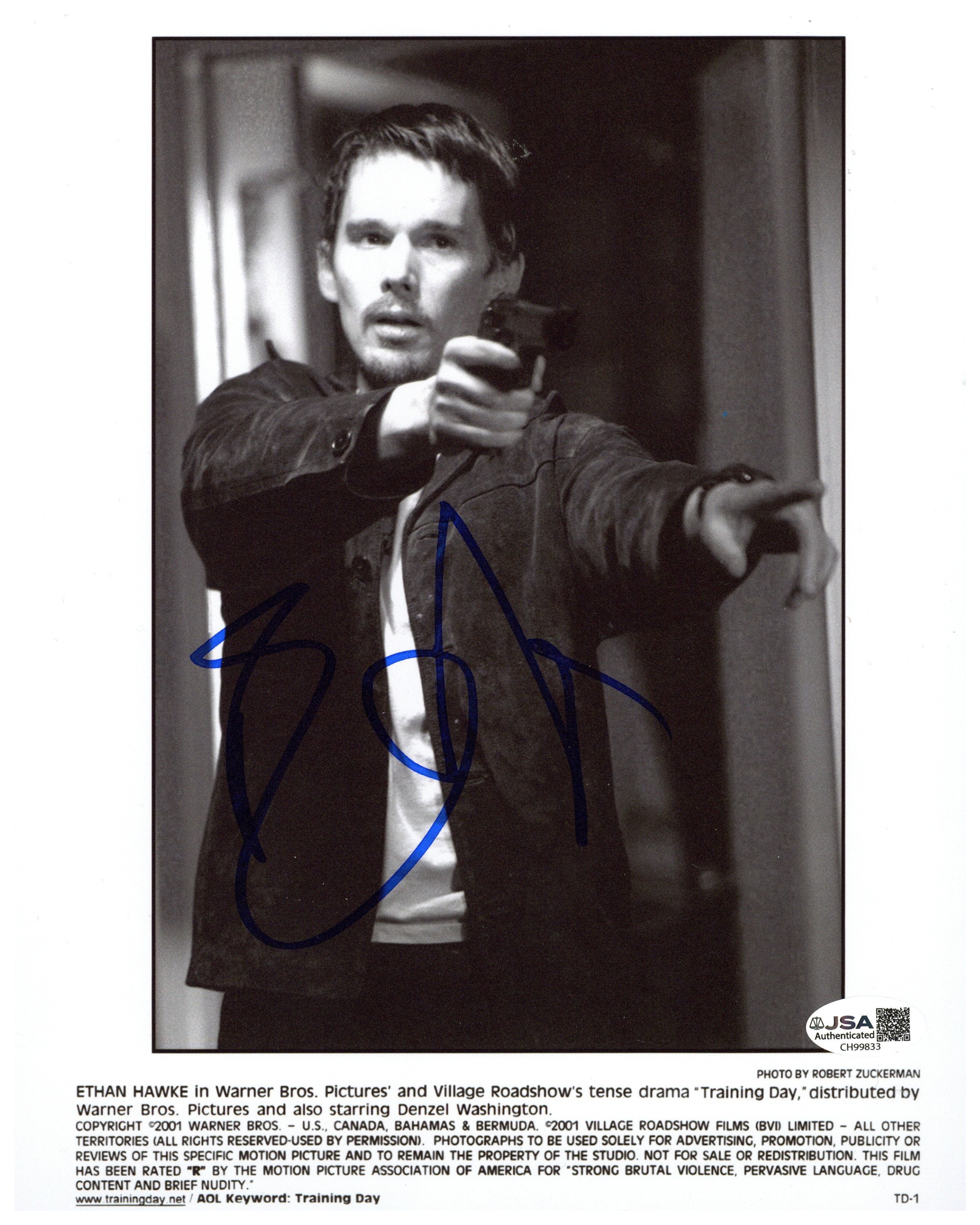 Authenticated by JSA (James Spence Authentication), this signed photo comes with a Certificate of Authenticity (COA), ensuring the genuineness of Ethan Hawke's autograph. Whether you're a devoted fan of Training Day, an admirer of Hawke's talent, or simply appreciate collectible memorabilia, this signed photo is a prized addition to any collection.