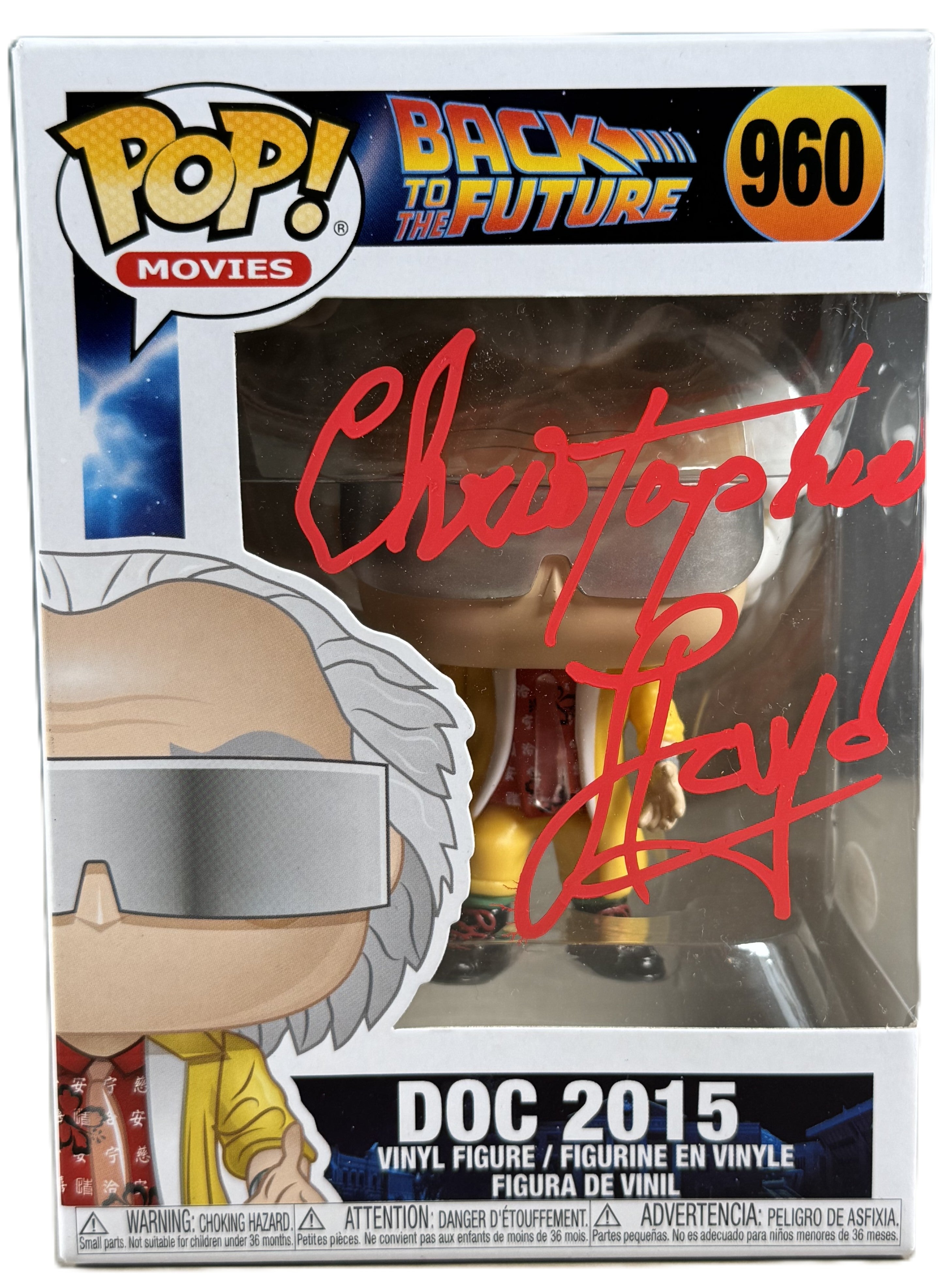 Authentic hand-signed Funko Pop vinyl figure of Christopher Lloyd, featuring his legendary role as Emmett Brown in Back to the Future.
