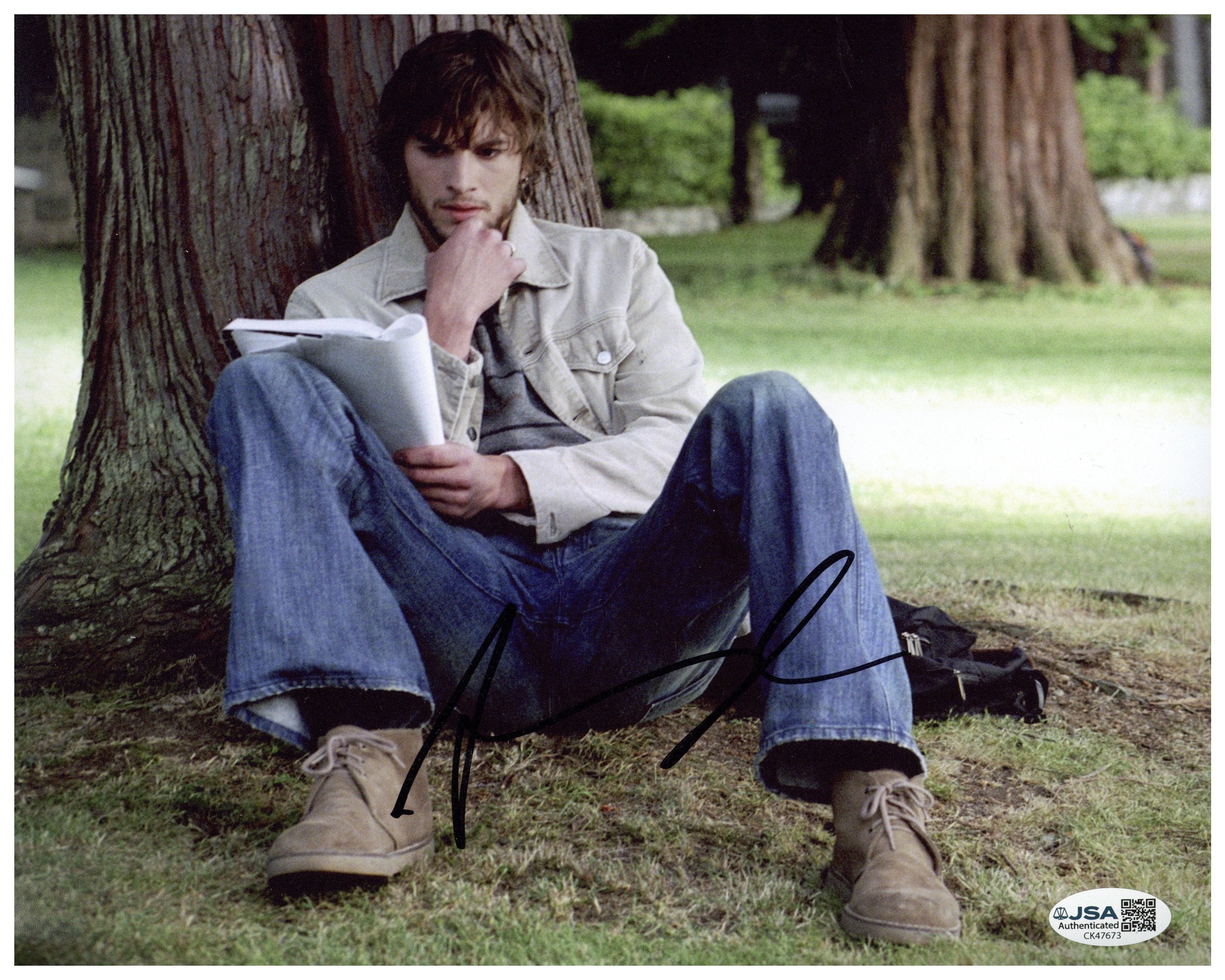 Authentic hand-signed 8x10 photo of Ashton Kutcher, featuring his starring role as Evan Treborn in the psychological thriller The Butterfly Effect. This autograph is fully authenticated by James Spence Authentication (JSA) and includes a Certificate of Authenticity (COA).