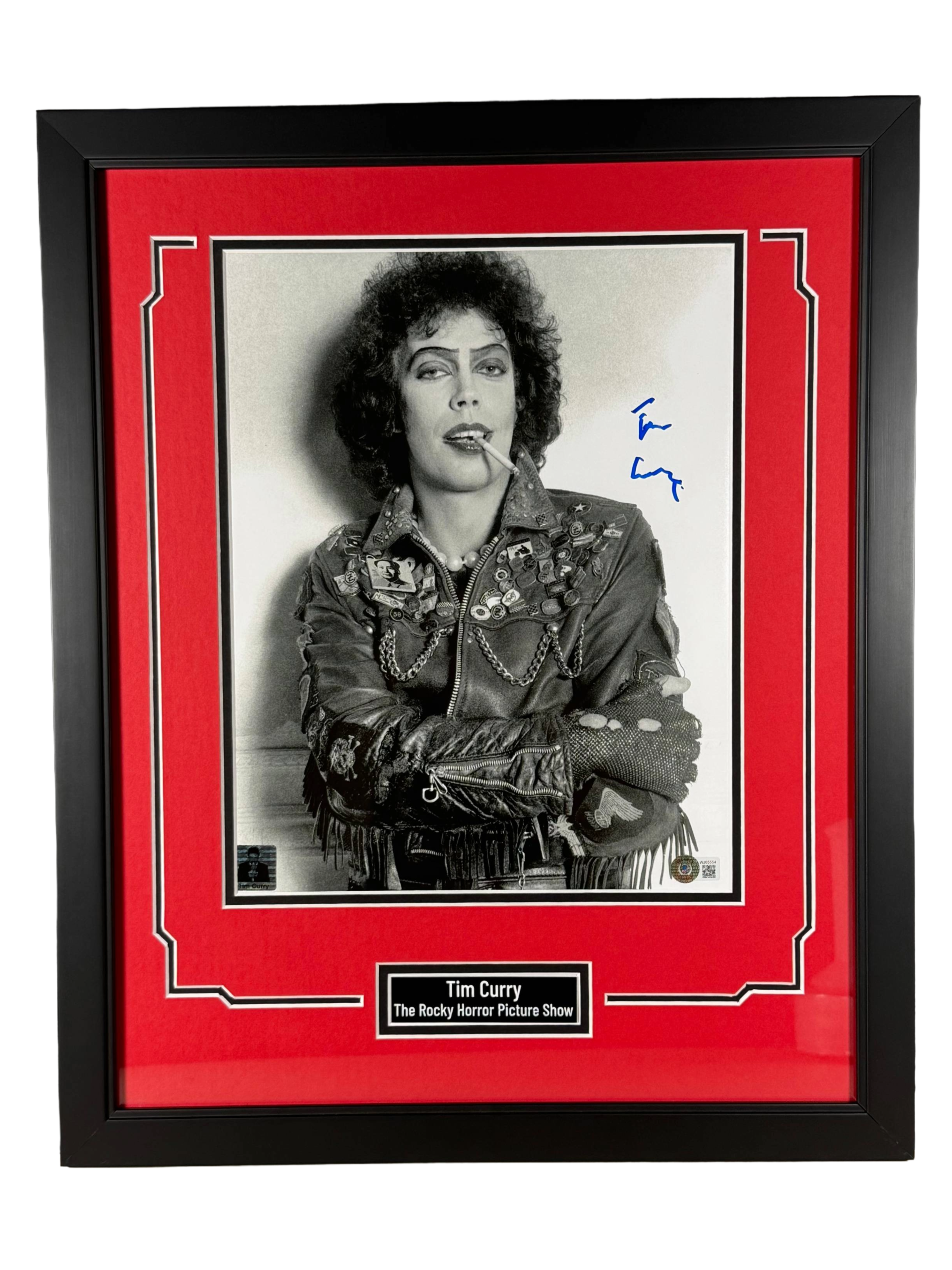 Authentic hand-signed 11x14 photo of Tim Curry, featuring his iconic portrayal of Dr. Frank-N-Furter in the cult classic The Rocky Horror Picture Show (1975).
