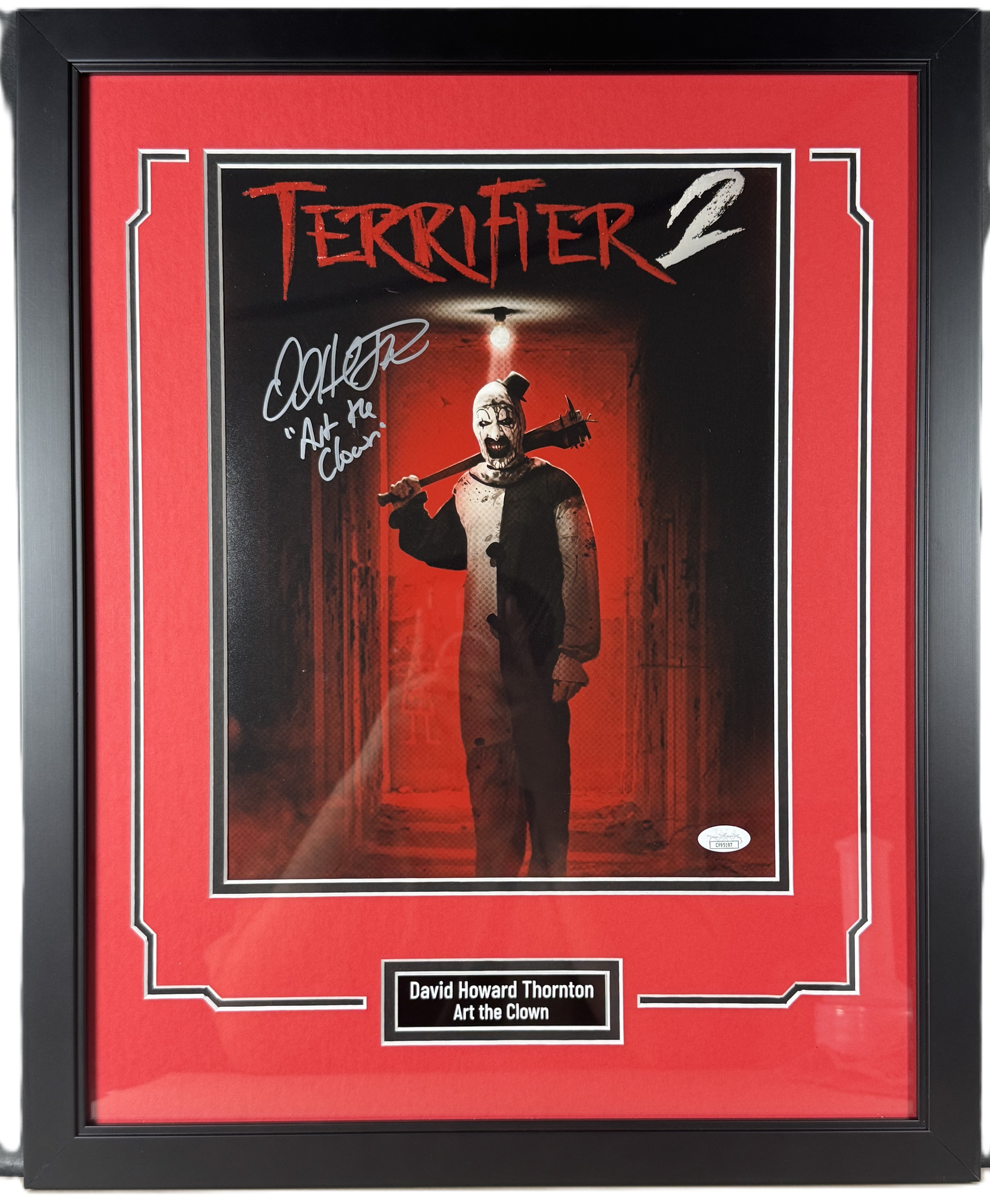 This 11x14 photo showcases Art the Clown in sinister detail and is hand-signed by David Howard Thornton. For guaranteed authenticity, the autograph includes a JSA COA (James Spence Authentication), ensuring it’s a genuine collectible for fans and collectors alike.