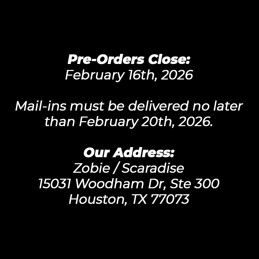 Ship Mail-ins to: Attn: Scaradise / Zobie, 15031 Woodham Drive #300, Houston, TX 77073 and refer to our How to Mail-In Page for instructions.