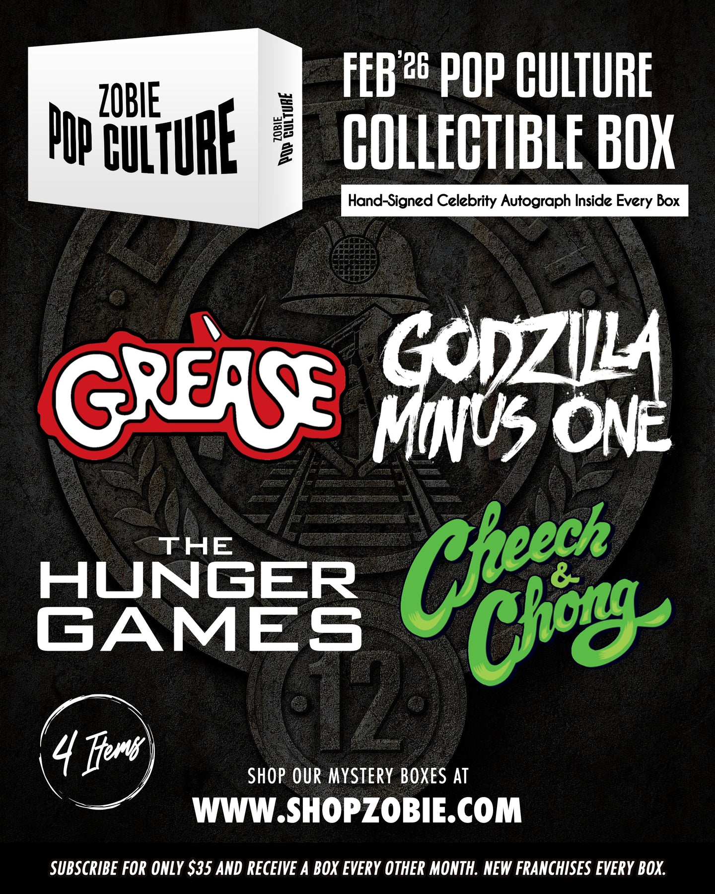 Our Zobie Pop Culture box is a limited edition bi-monthly subscription box that includes pop culture themed collectible items, centered around authentic celebrity autographs.