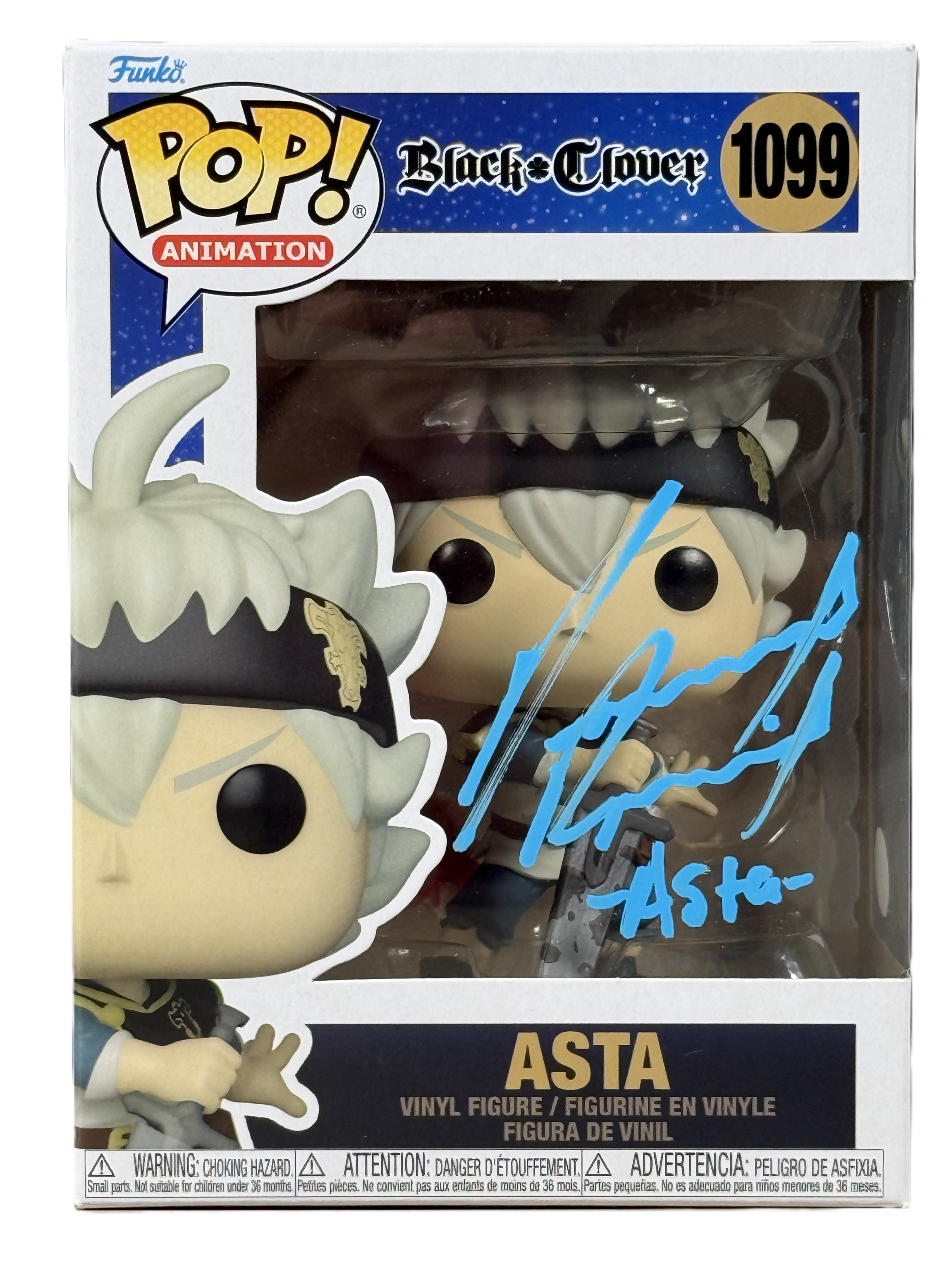 Authentic hand-signed Funko Pop #1099 of Dallas Reid, featuring his voice role as Asta in the popular anime series Black Clover.