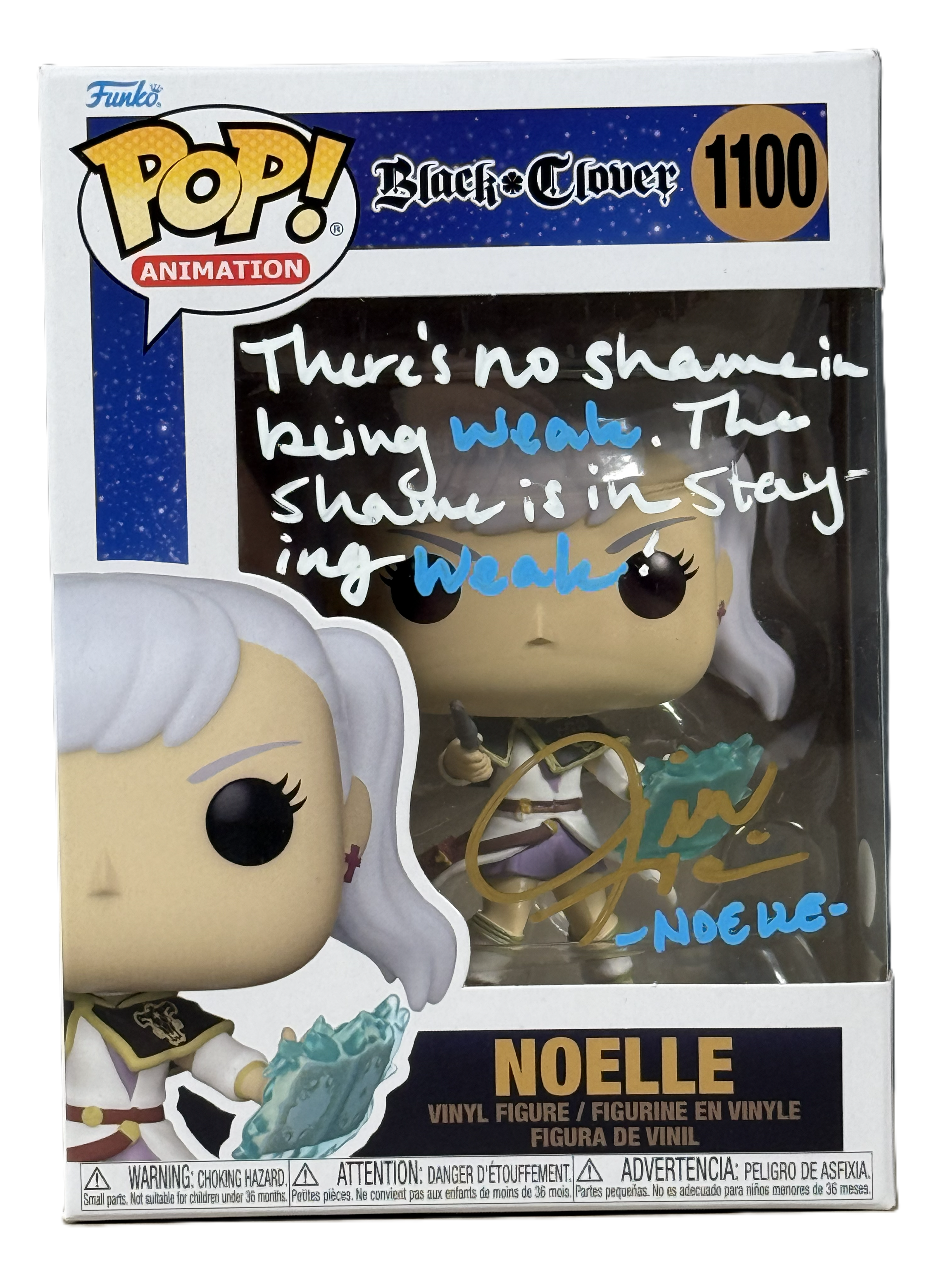 Add royal magic to your anime collection with this Jill Harris signed Funko POP! featuring Noelle Silva (#1100) from the hit anime series Black Clover. Jill Harris is known to anime fans as the English voice of Noelle Silva, bringing depth, strength, and emotion to one of the series’ most beloved characters as she grows into a powerful Magic Knight.