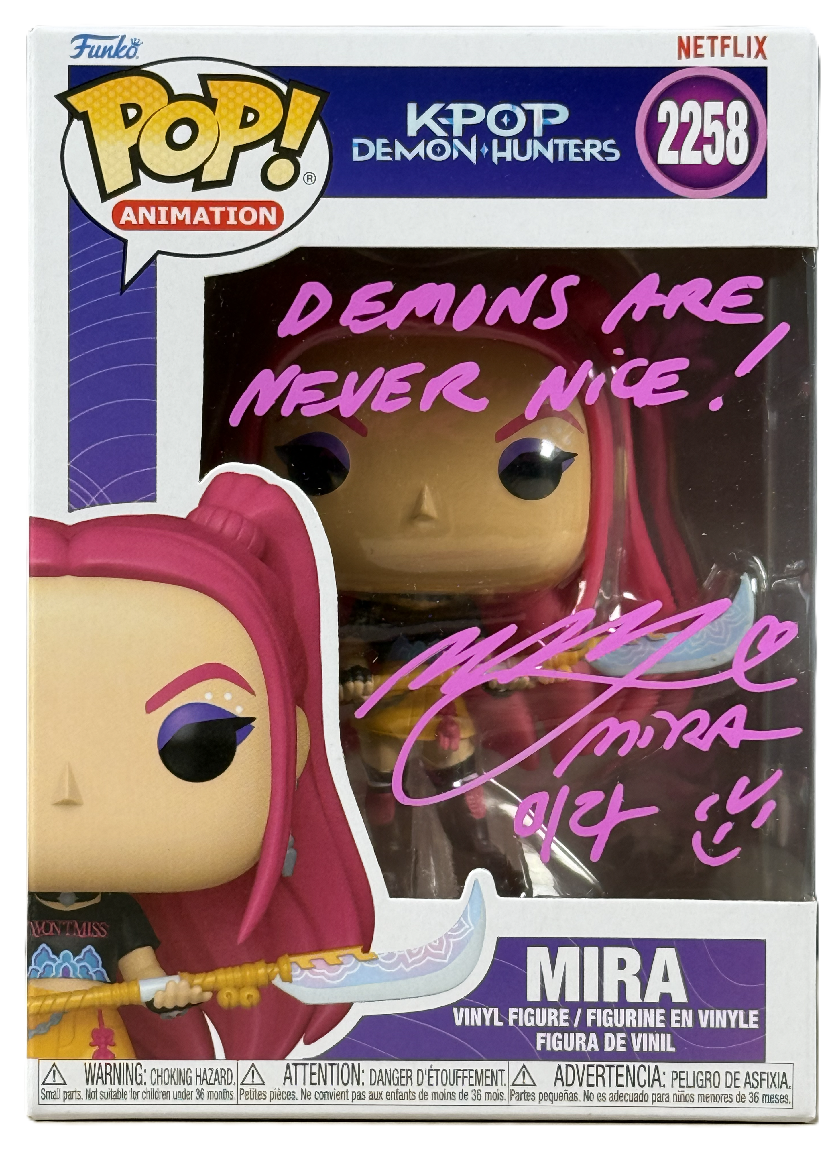 Authentic hand-signed Funko Pop vinyl figure of May Hong, featuring her role as Mira in KPop Demon Hunters.