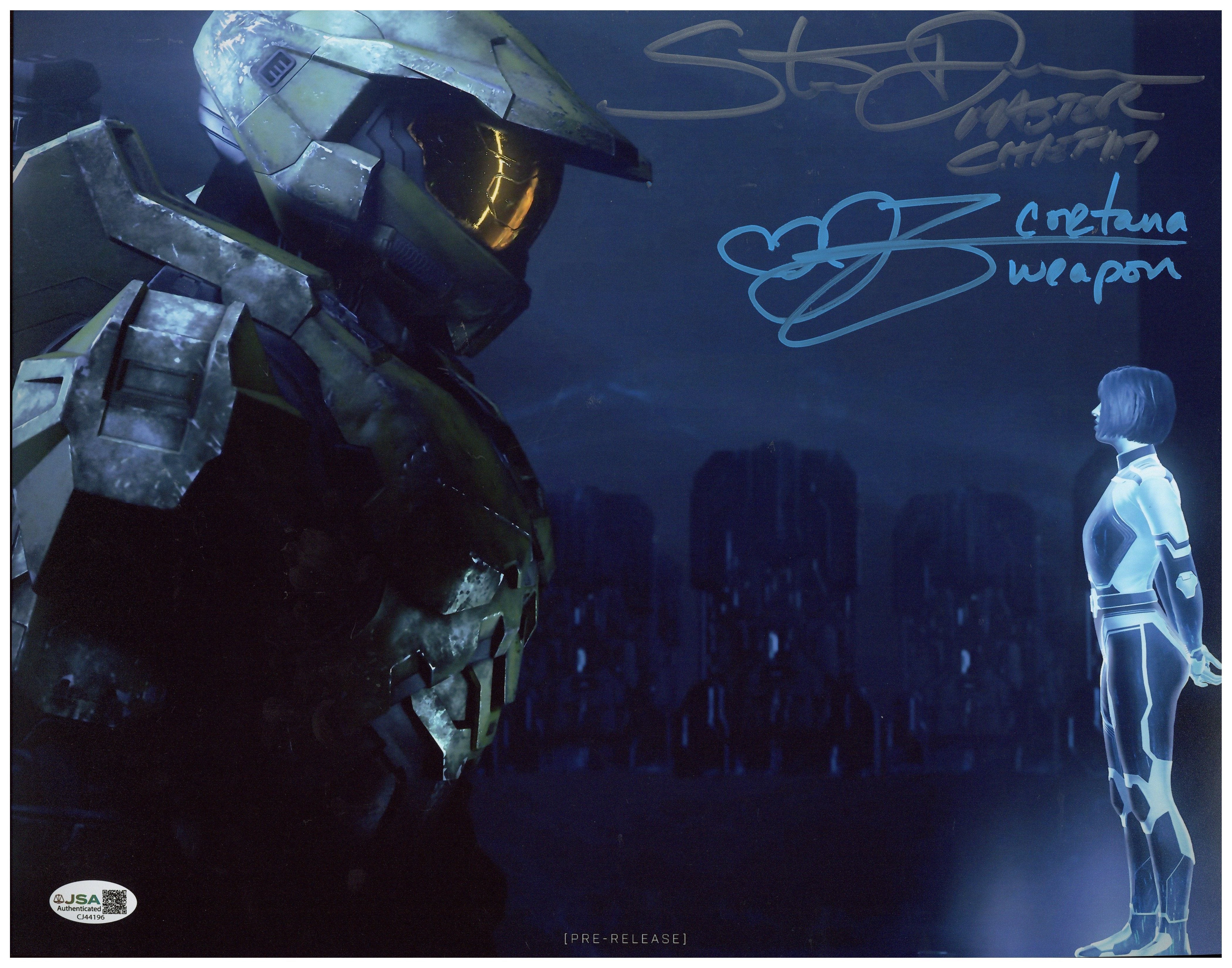 Add an iconic piece of gaming history to your collection with this Steve Downes & Jen Taylor signed 11x14 photo, featuring the voices of Master Chief and Cortana from the legendary Halo video game series. This collectible is a must-have for fans of the franchise and voice actor autograph collectors alike.