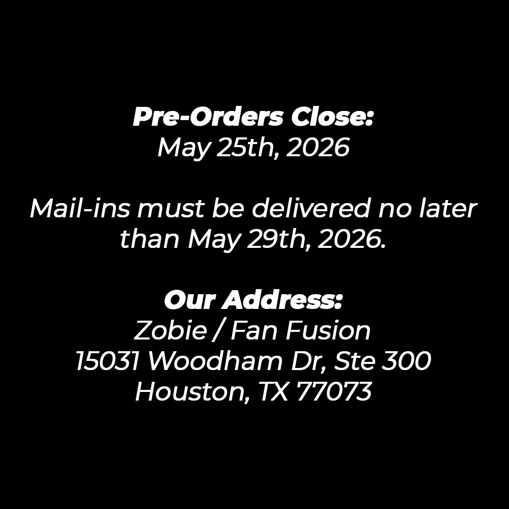 Ship Mail-ins to: Attn: Fan Fusion / Zobie, 15031 Woodham Drive #300, Houston, TX 77073 and refer to our How to Mail-In Page for instructions.