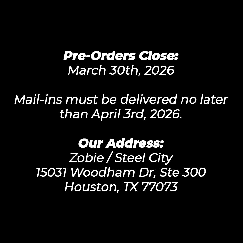 Ship Mail-ins to: Attn: Steel City / Zobie, 15031 Woodham Drive #300, Houston, TX 77073 and refer to our How to Mail-In Page for instructions.