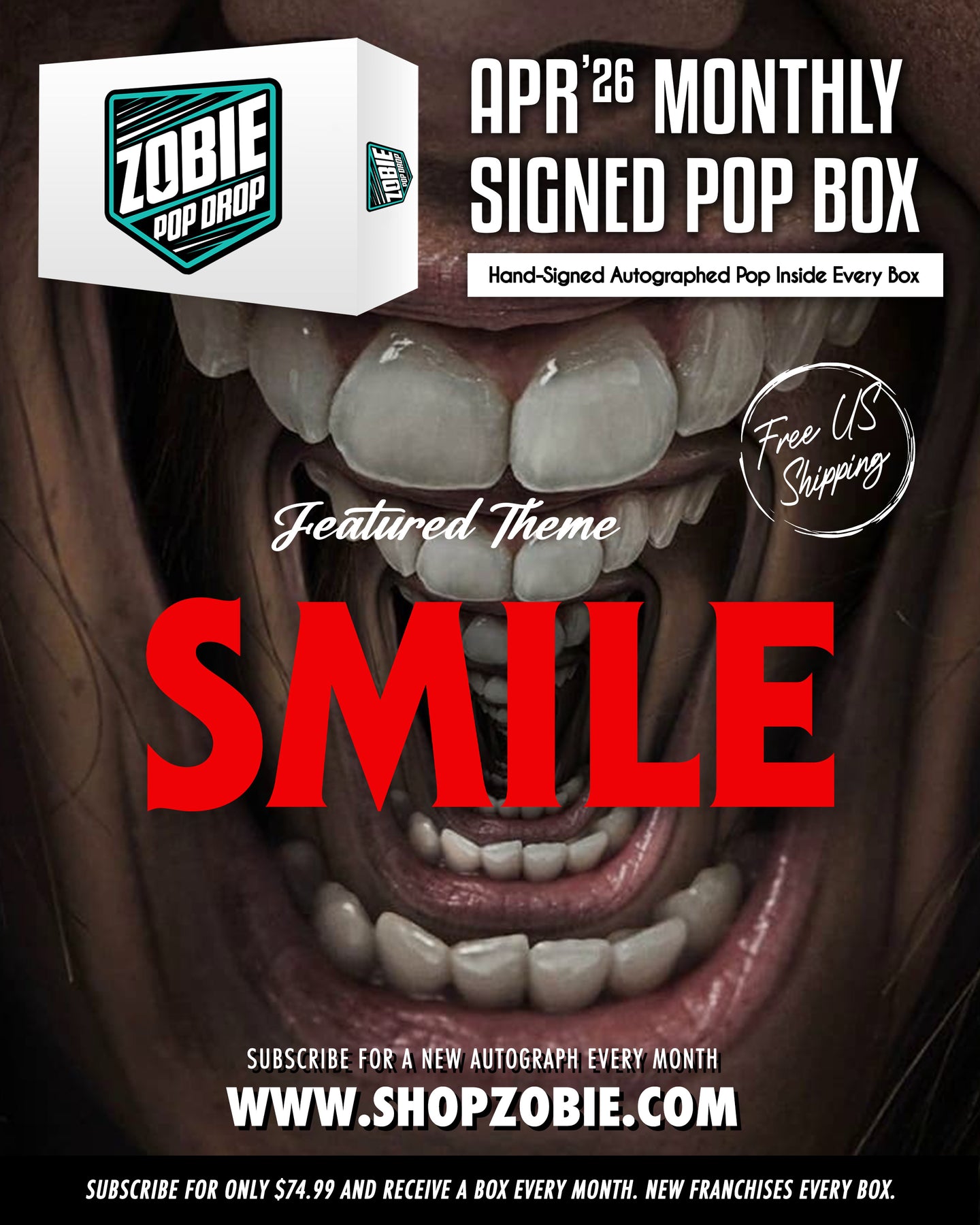 Zobie Pop Drop is a monthly subscription box and includes 1 Authentic Autographed Funko Pop. Each month, we will feature a new celebrity and a new theme.